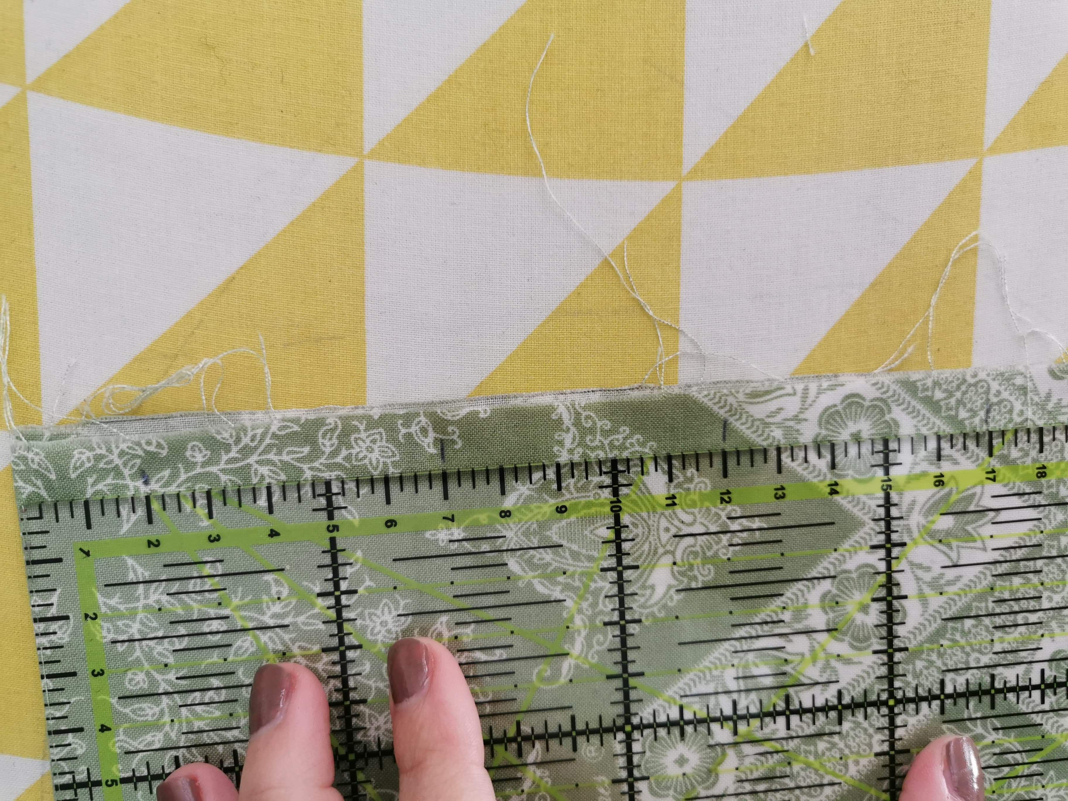 These are our folding marks. Hold the fabric on each side at 7cm / 2.75in and fold it over the marks at 2cm / 0.8in from the edge.